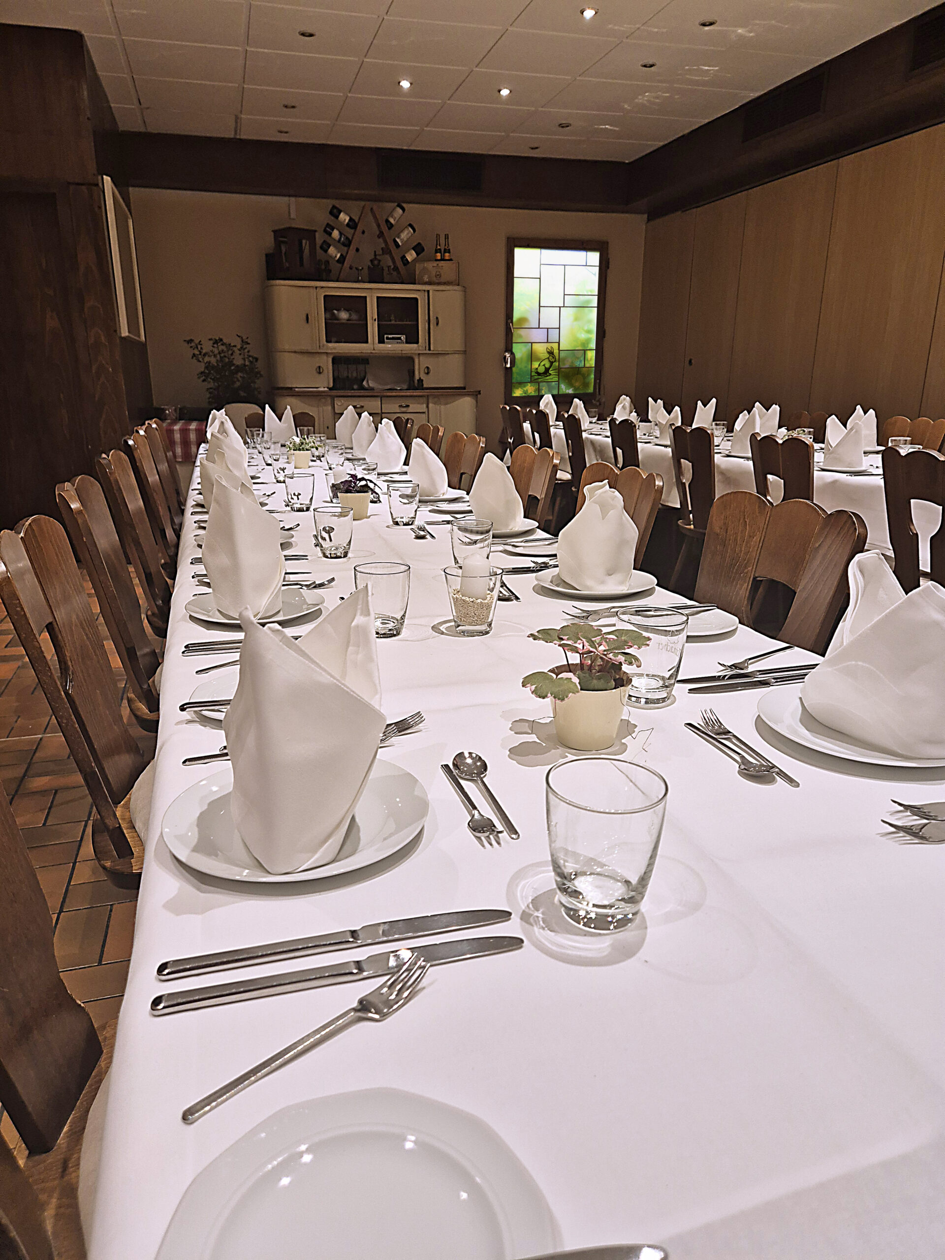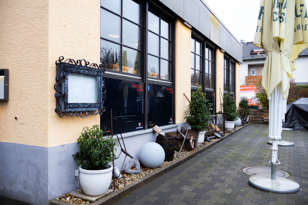 Direkt an das Restaurant schließt die Vereinsstube an: Nahe der Theke, umrahmt von einer gemütlichen u-förmigen Eckbank, können gut 20 Gäste Platz nehmen – gemütlich, umgeben von einer Vitrine mit Pokalen und „Historischem“ aus der Geschichte der Vereinigten Turnerschaft Hagsfeld.